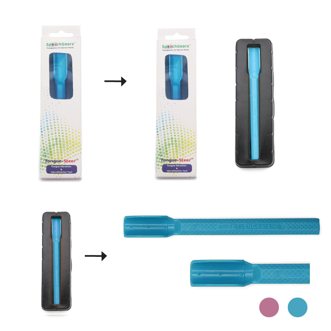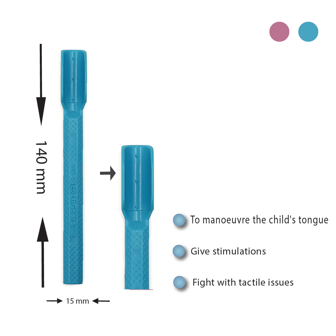 Therapists/Parents use Tongue-Steer to manoeuvre the child's tongue to the extend he/she finds difficulty in, also to demonstrate them to place the tongue in a particular position to articulate a specific sound. It has three dots to give stimulations, particularly to the sides of the tongue to address tactile issues.