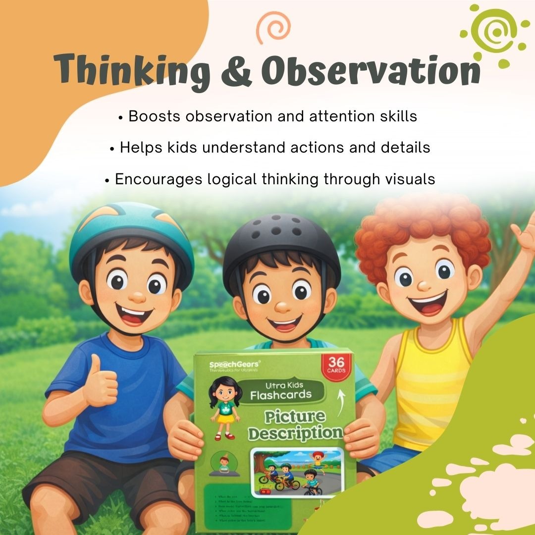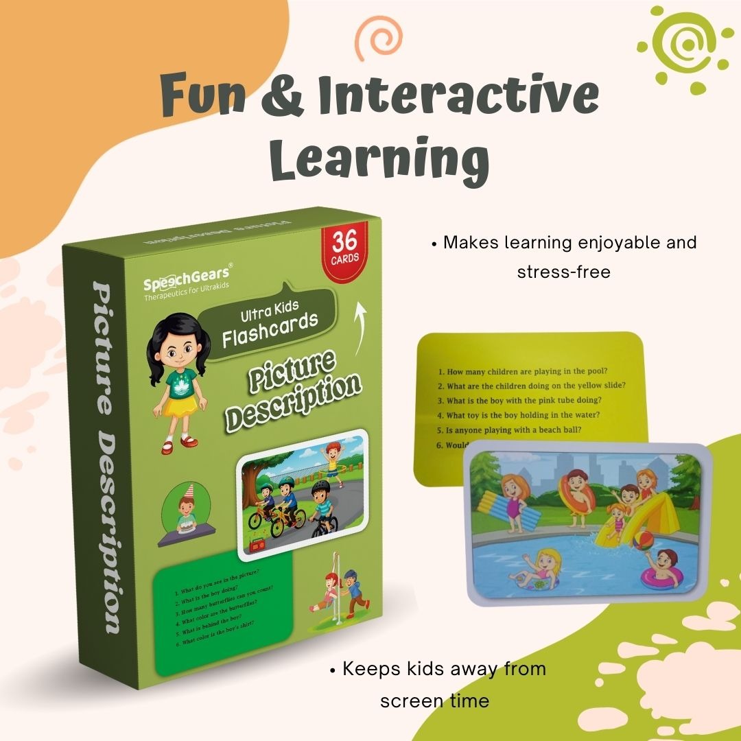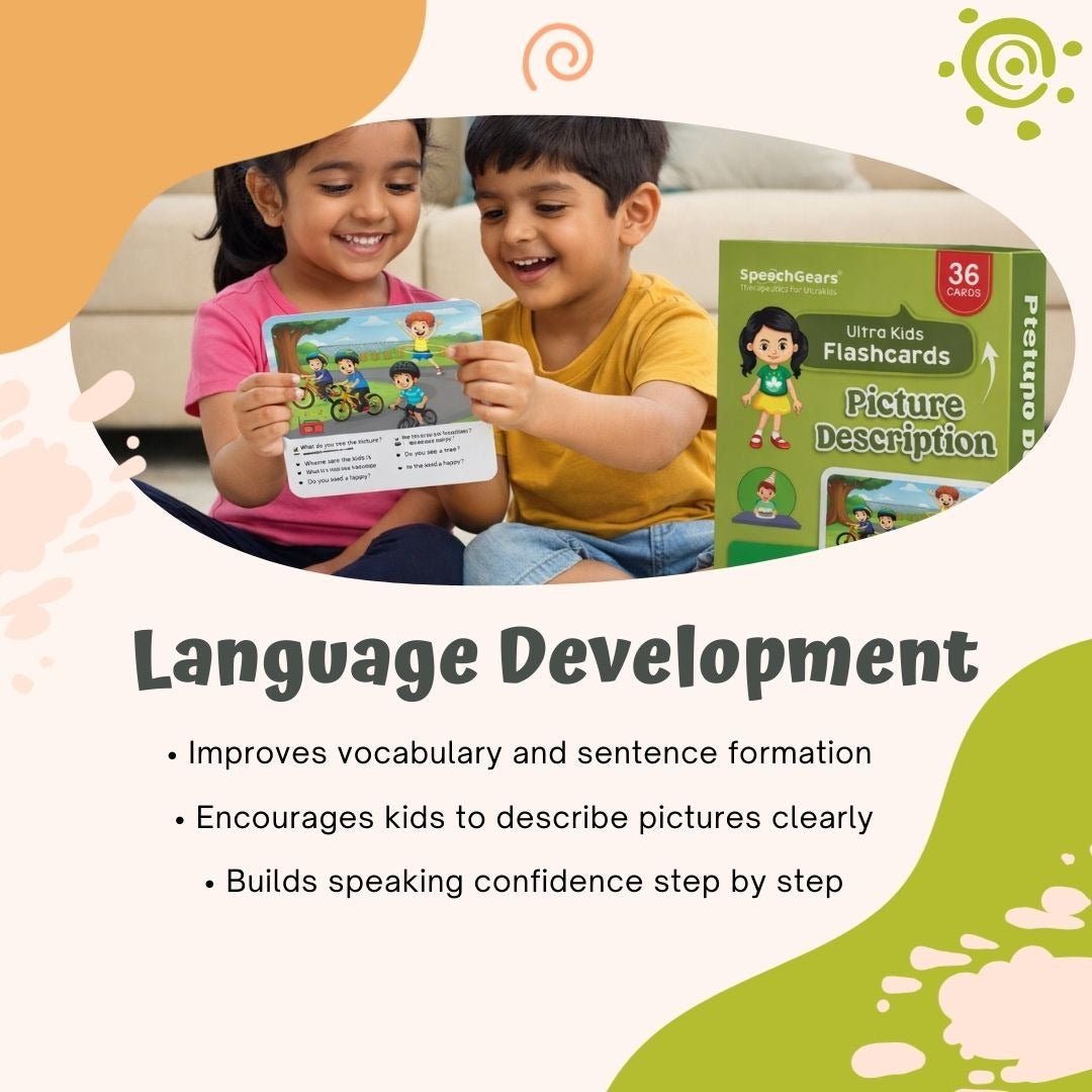 The Picture Description Cards by SpeechGears are a powerful speech and language development tool designed to help children improve their communication, observation, and storytelling abilities. Through engaging visual scenes and guided prompts, children learn to describe what they see, build meaningful sentences, and express ideas clearly.