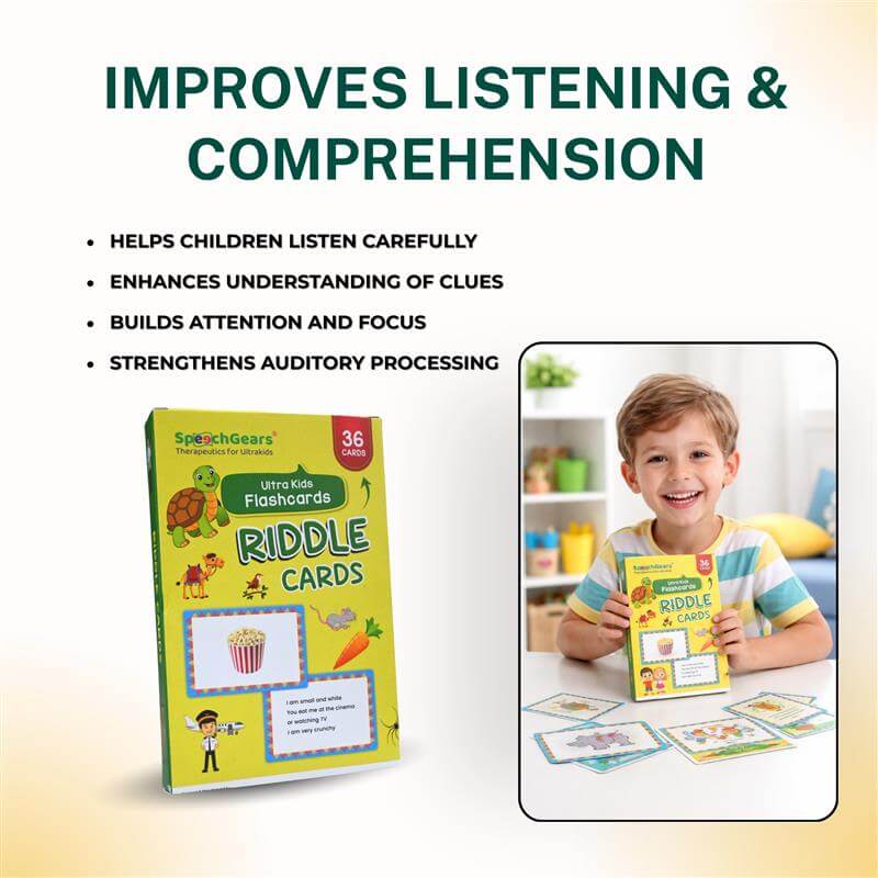 Boost speech and vocabulary with Riddle Cards by SpeechGears India. Designed to bridge the gap between picture recognition and verbal expression, they help children overcome learning hurdles through interactive play.